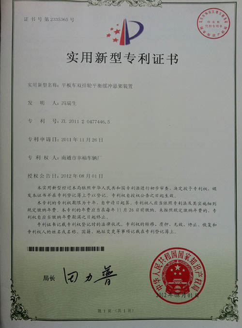平板車雙排輪減震緩沖懸架裝置專利證書